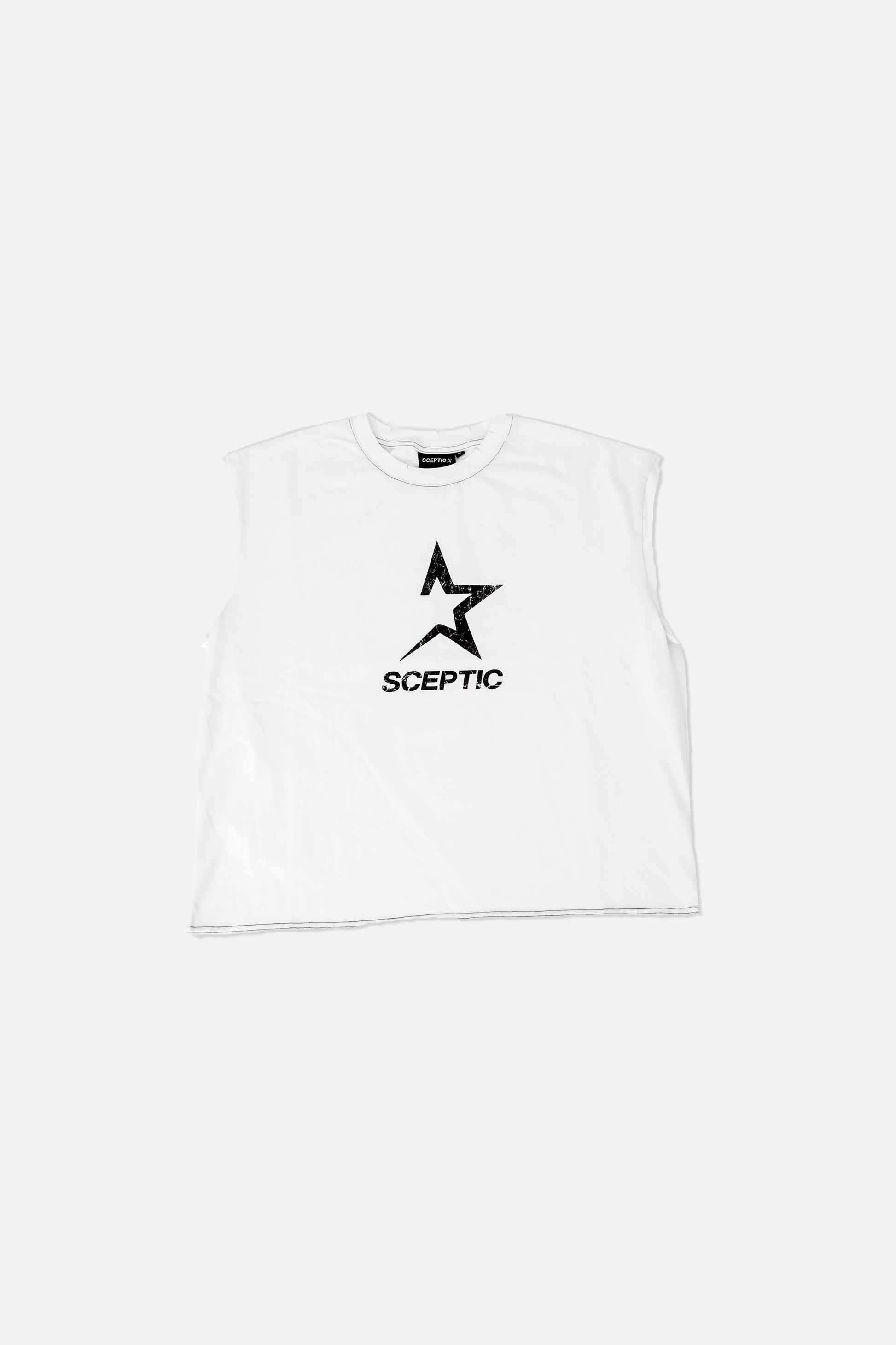 White sleeveless tee with boxy fit washed effect. This t-shirt shows the purity contained inside each person. On the front, a classic image of the brand name next to the symbol in screen printing with a cracked effect. Inspired in Ibiza.