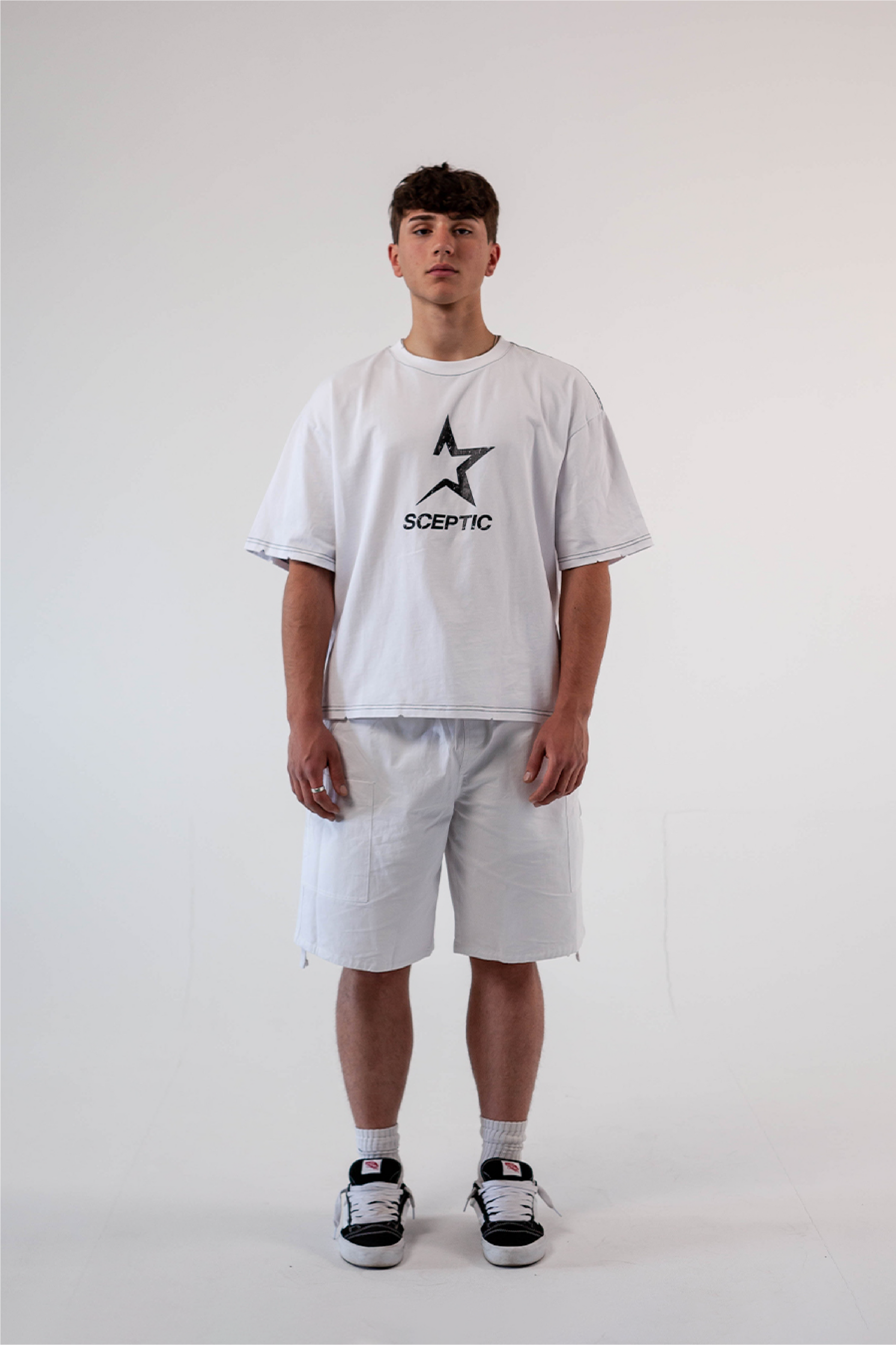 White t-shirt with boxy fit washed effect. This t-shirt shows the purity contained inside each person. On the front, a classic image of the brand name next to the symbol in screen printing with a cracked effect.
