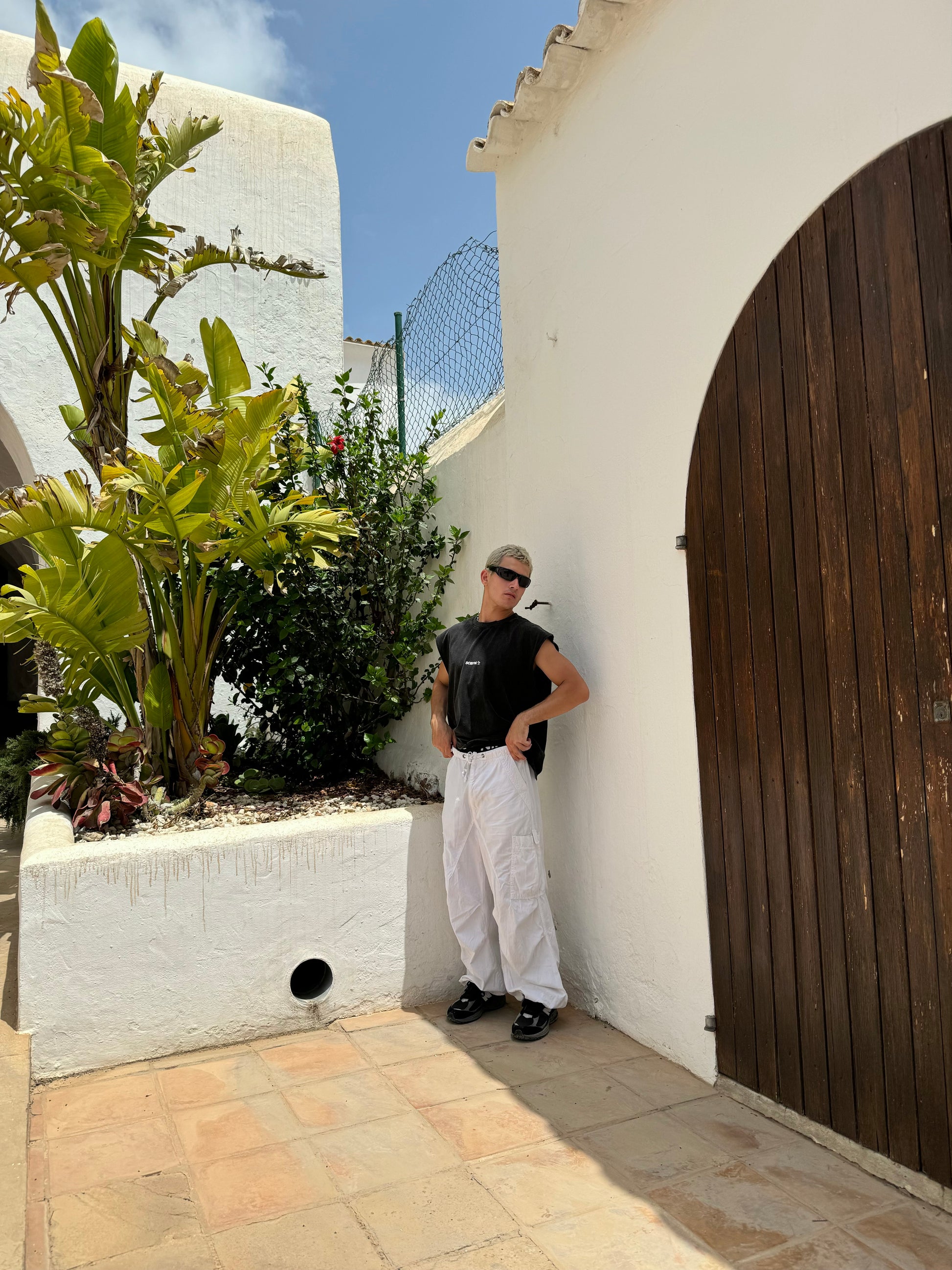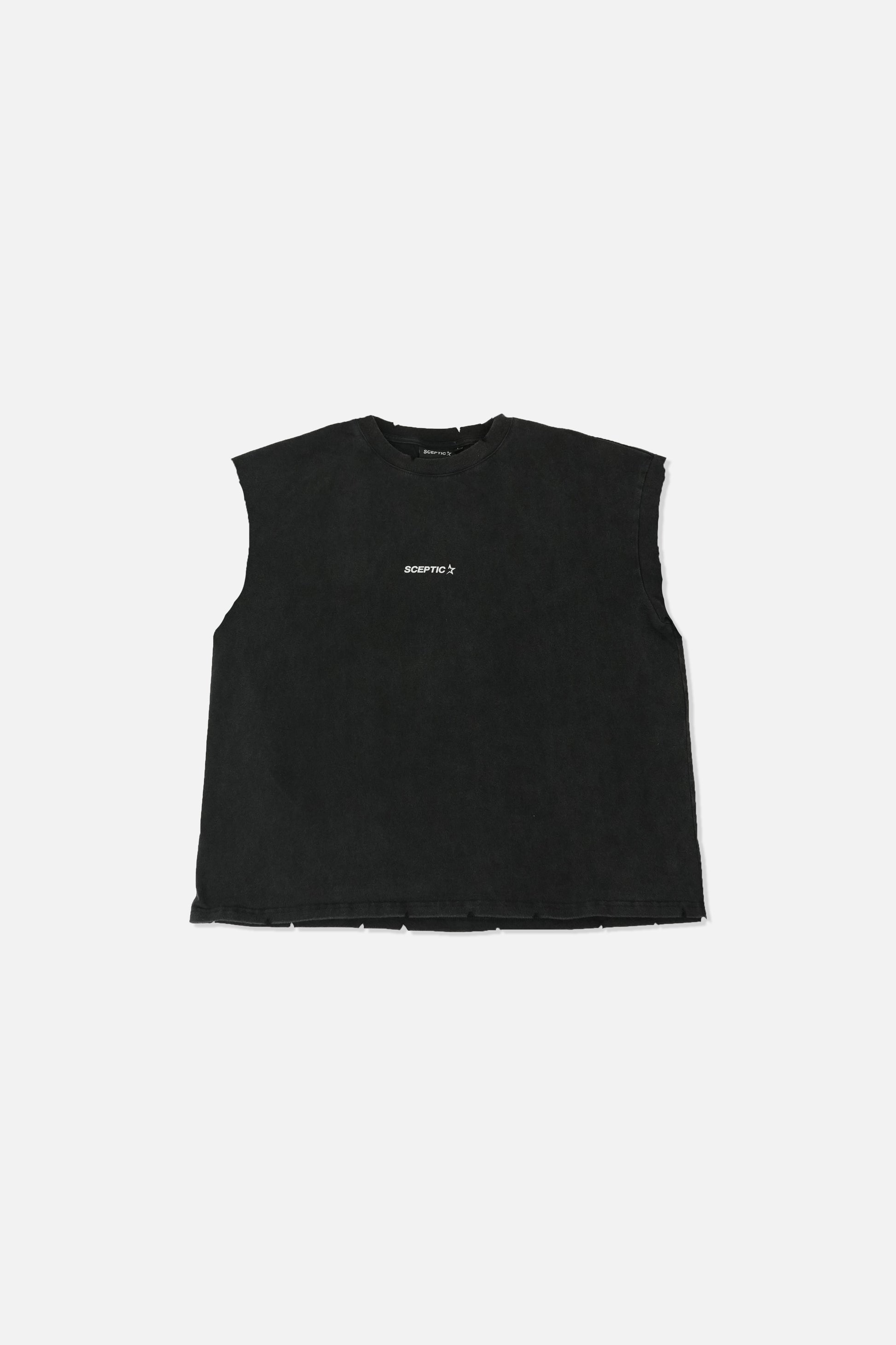 Black sleeveless tee with boxy fit washed effect. On the front, classic Sceptic image print in white screen printing. On the back, isotype of the star symbol in screen printing with cracked effect, giving a vintage look to this garment. Inspired in Ibiza.